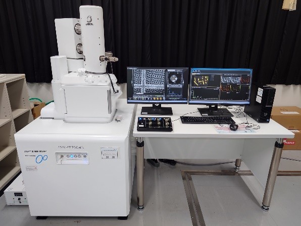 試料表面の観察、元素分析を行う装置です。写真倍率は5~600,000倍です。